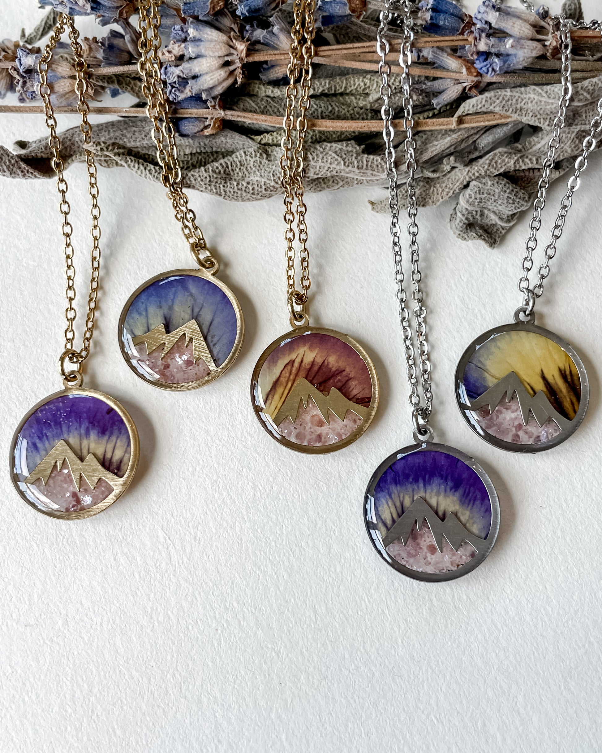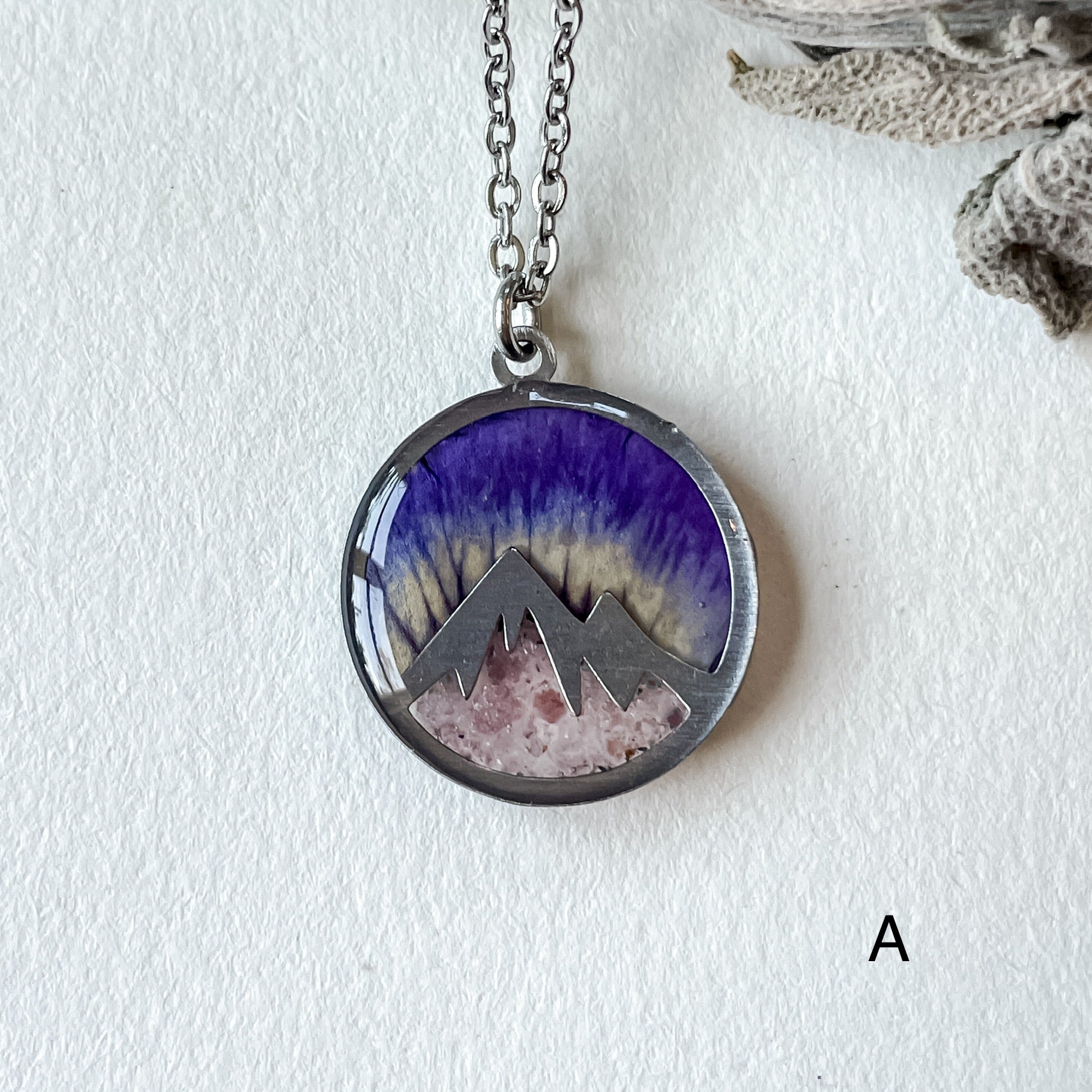 Pressed pansy offers remembrance and reflection, while lepidolite soothes the spirit with calm and clarity. A piece for finding beauty in transition, carrying wonset and reflection wherever you roam.