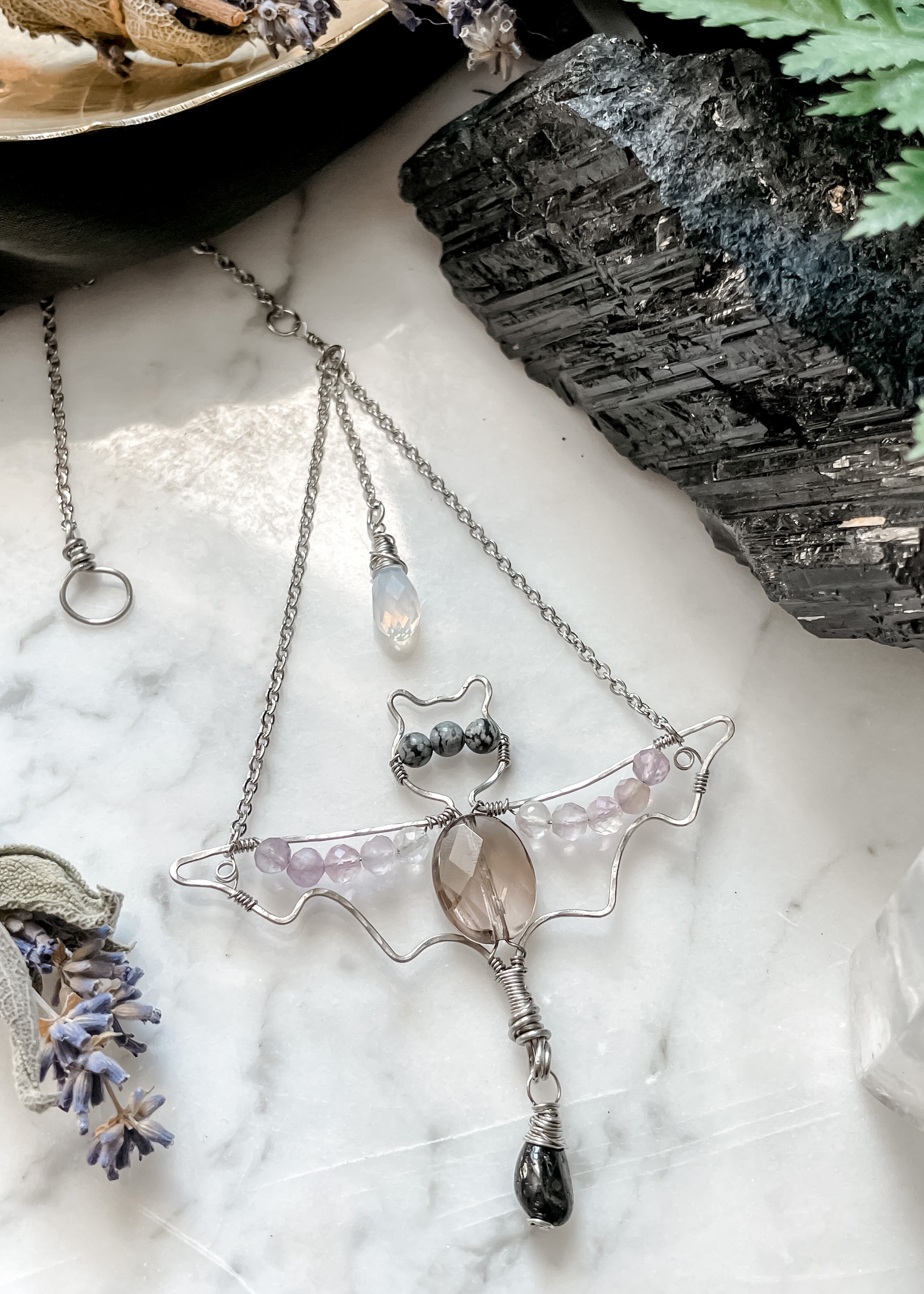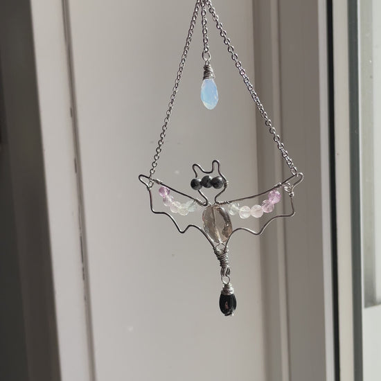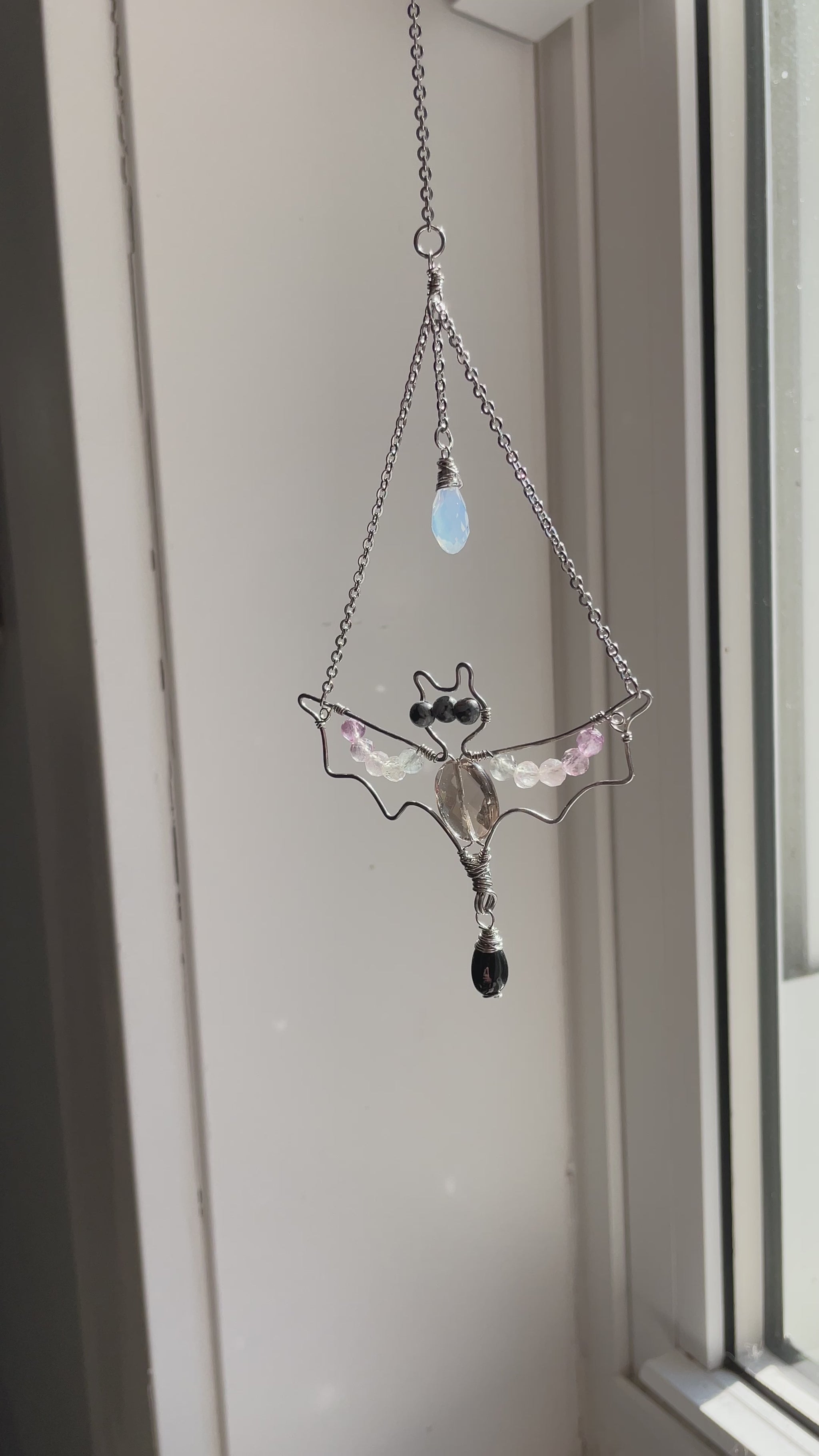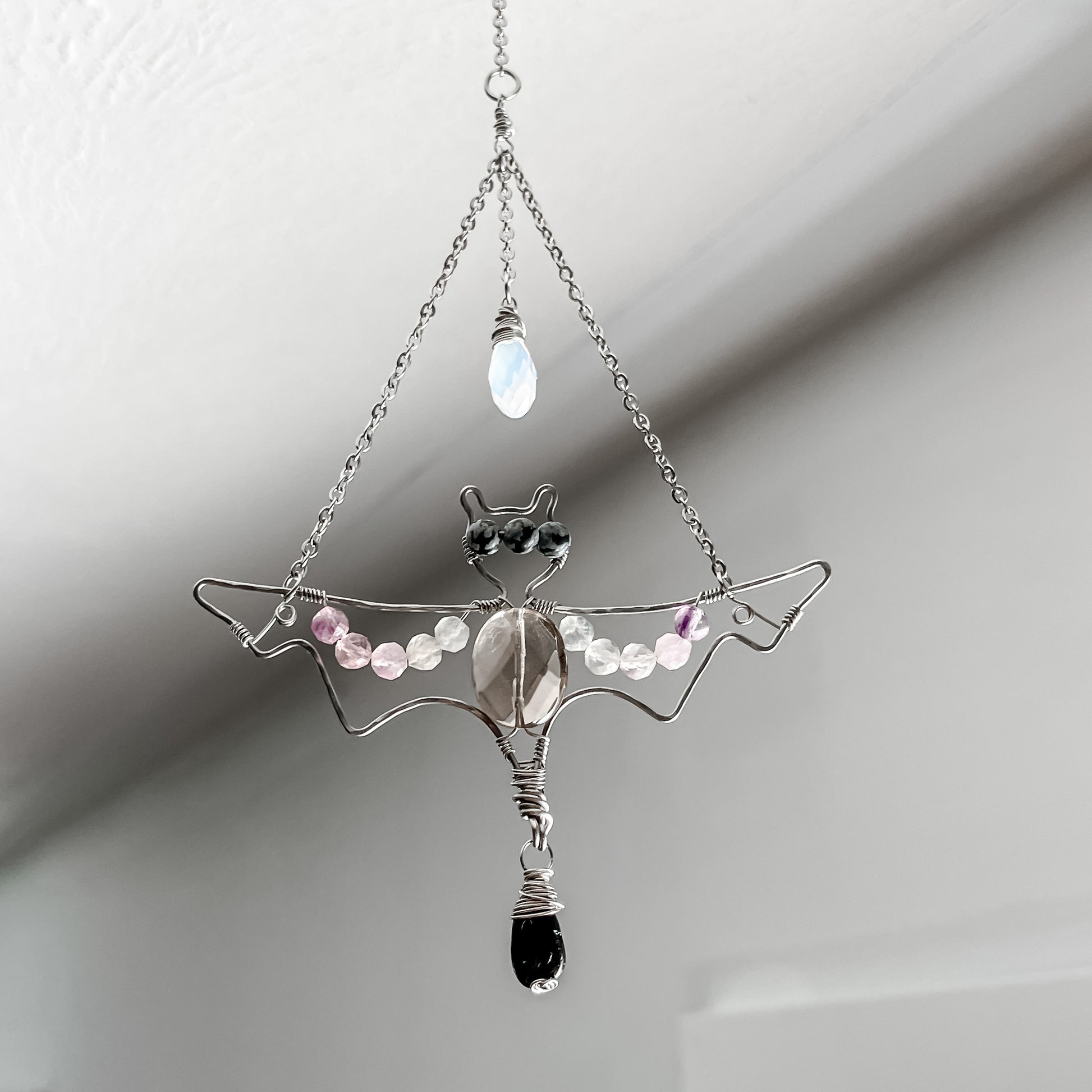 This wire wrapped bat sun charm is handmade with stainless steel wire and natural crystals. An Opal coloured crystal creates sparkle magic ✨