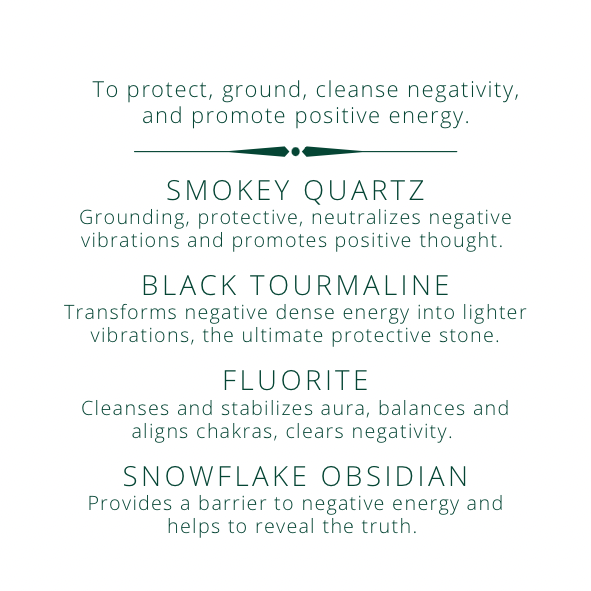 🦇 Crystals featured as the same ones as my Empath bracelet, designed for protection, grounding, and positive energy. Smokey Quartz, Fluorite, Black Tourmaline, and Snowflake Obsidian.