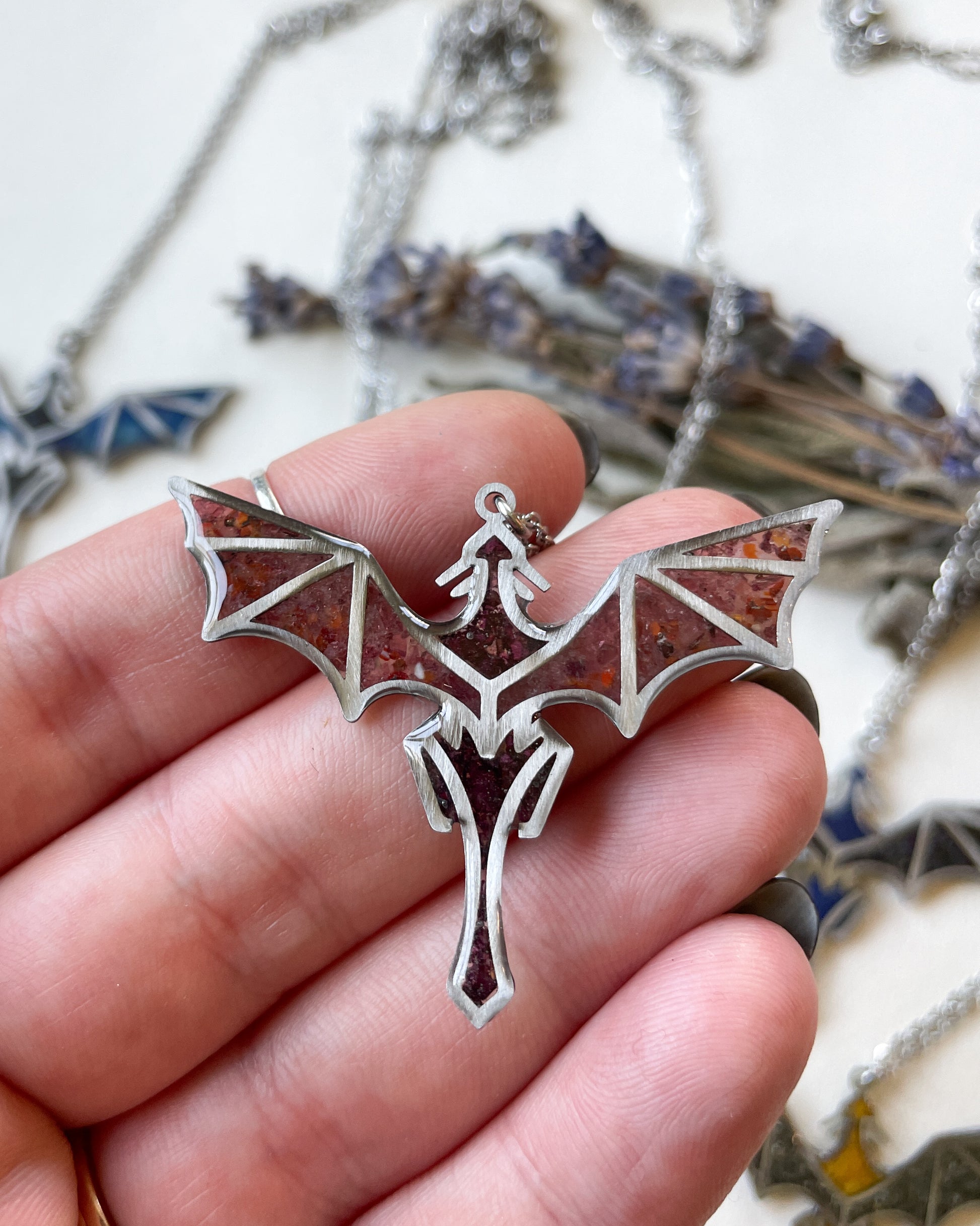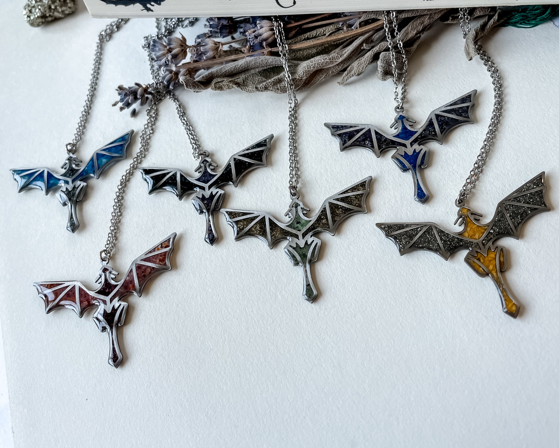 Bold, mystical, and untamed, these dragon necklaces capture the spirit of freedom and fire that fantasy realms are built on. Each dragon is set with real botanicals and crystals, combining strength, magic, and beauty in a piece both fierce and intentional.