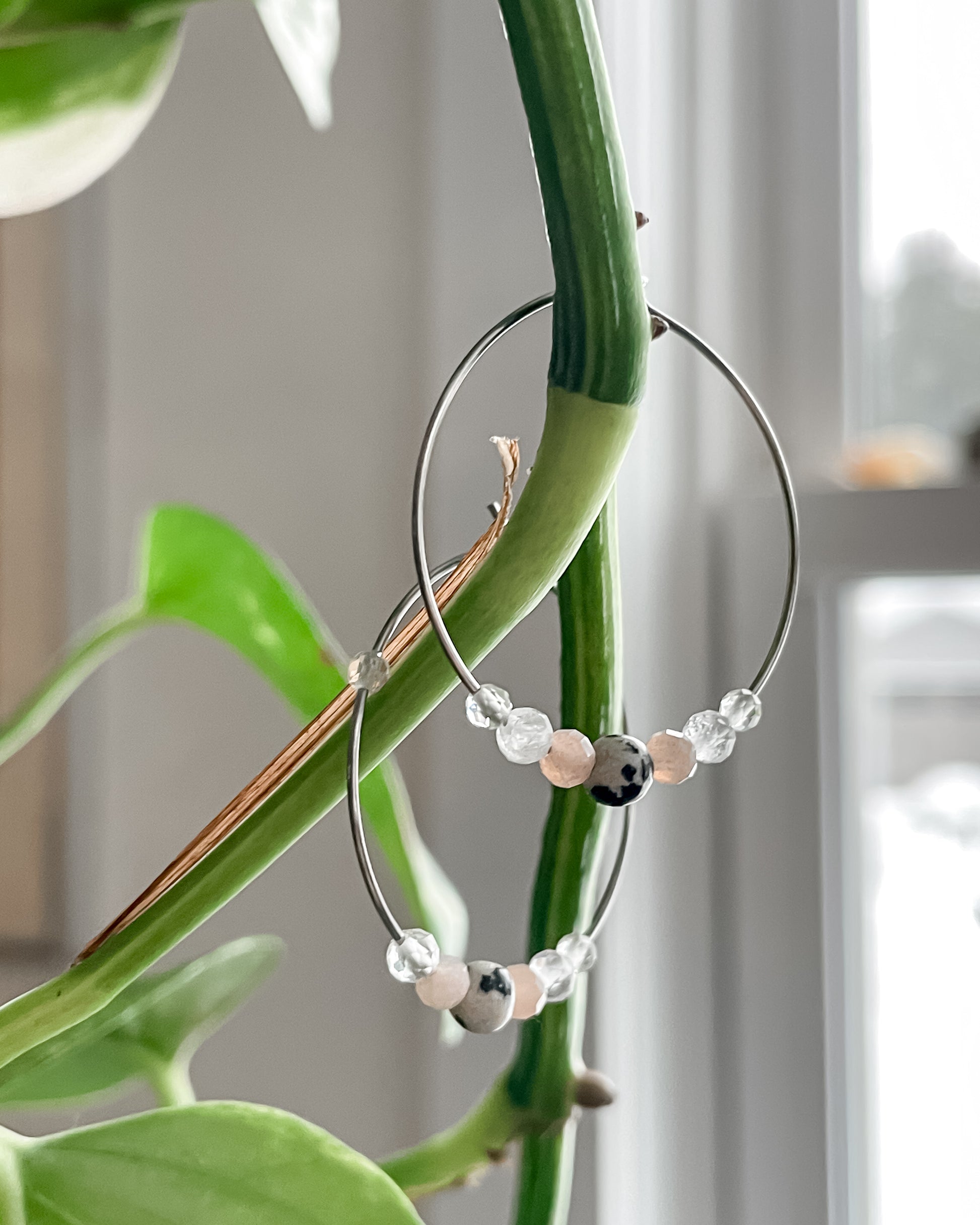 Created using stainless steel or gold coated stainless steel hoops with natural crystals. ✨