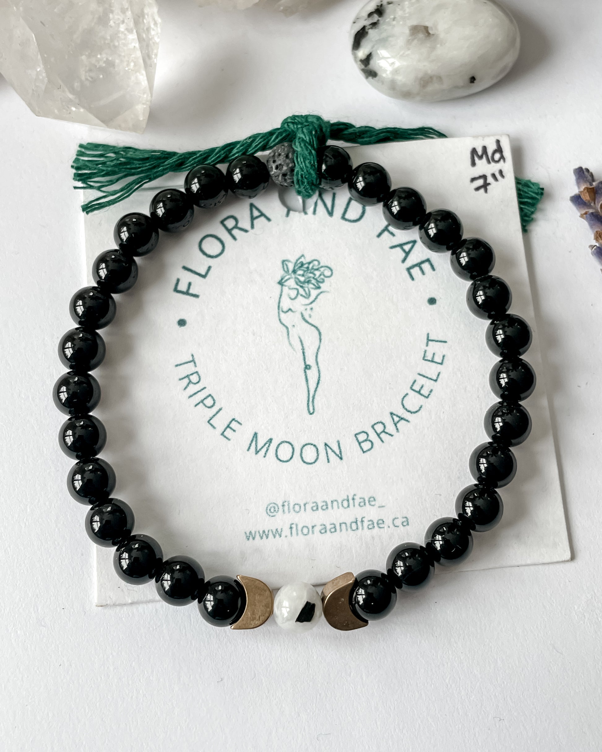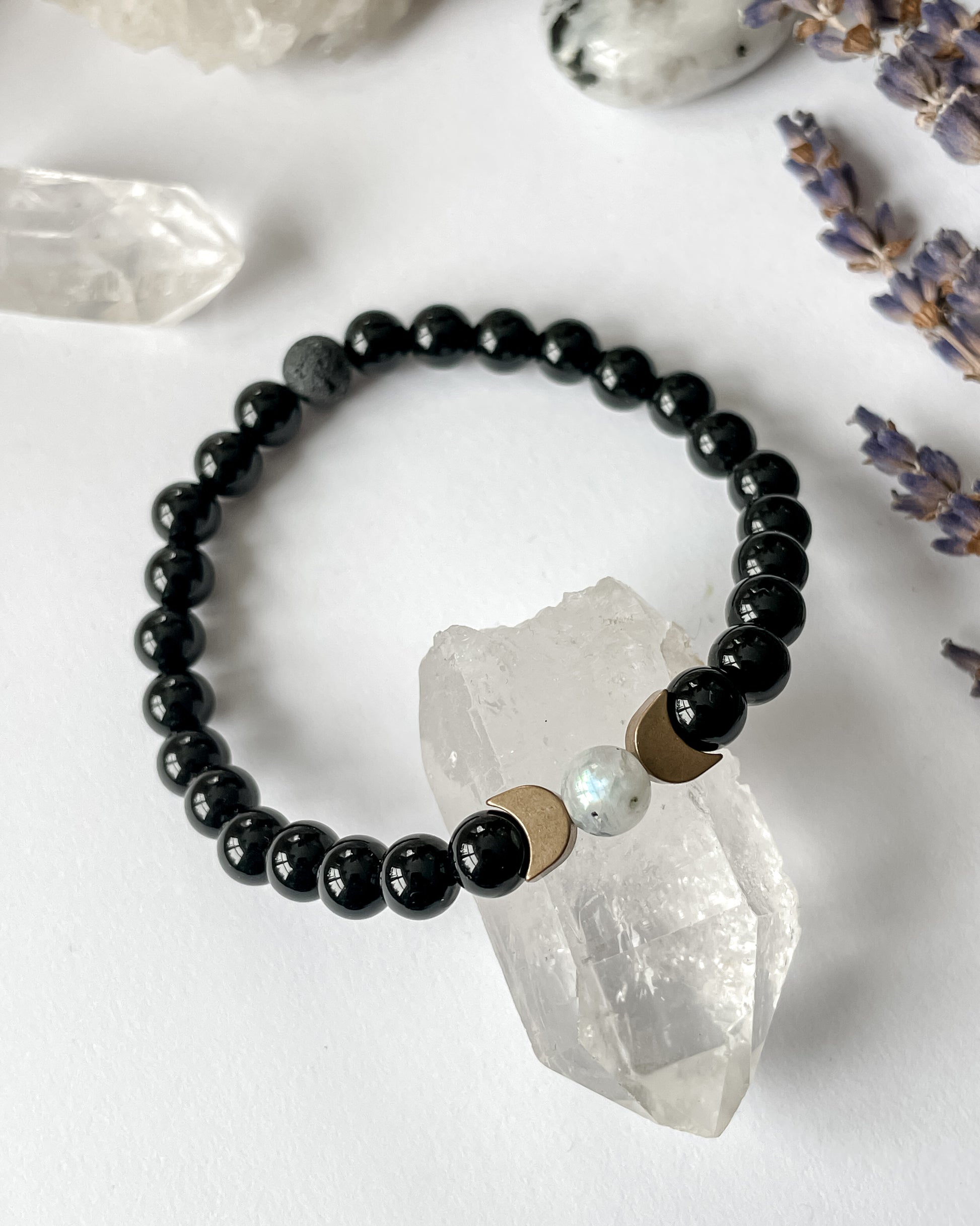 Designed with 6mm black onyx beads, brass crescent moons, and a labradorite bead.